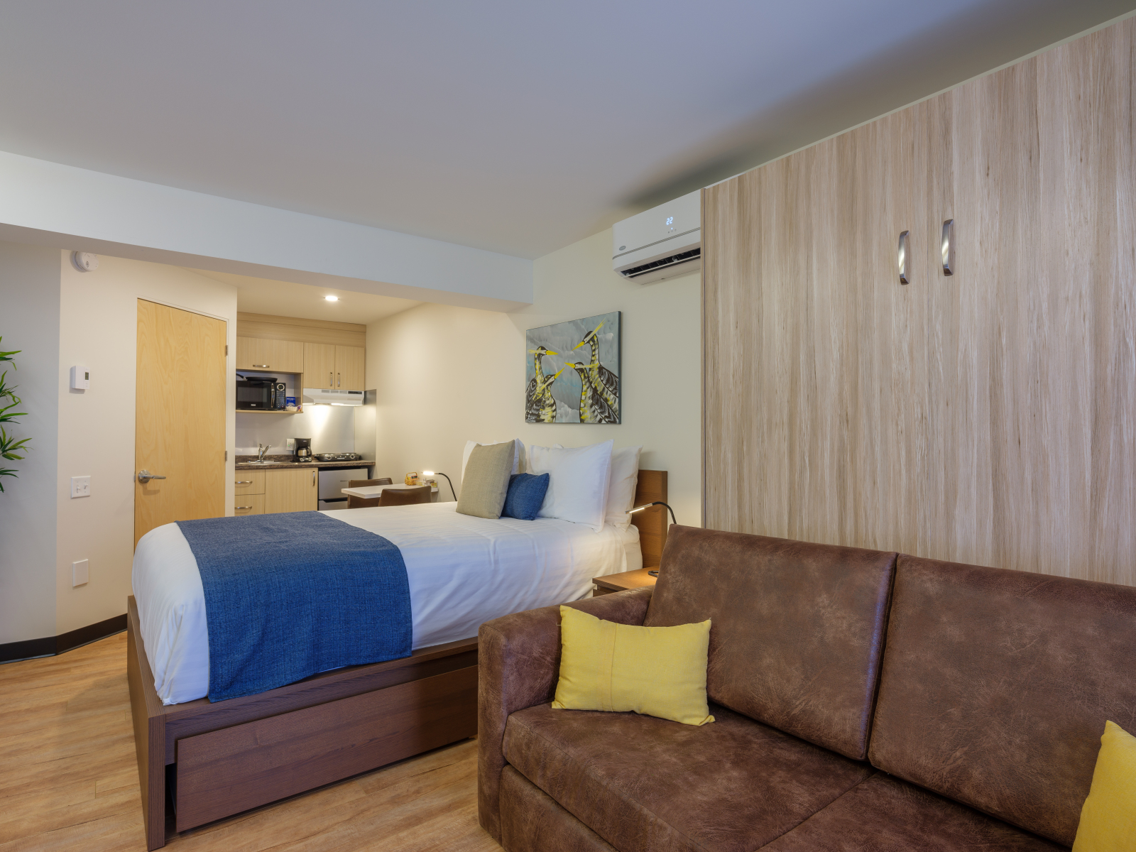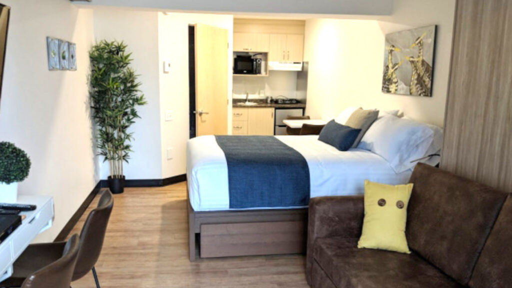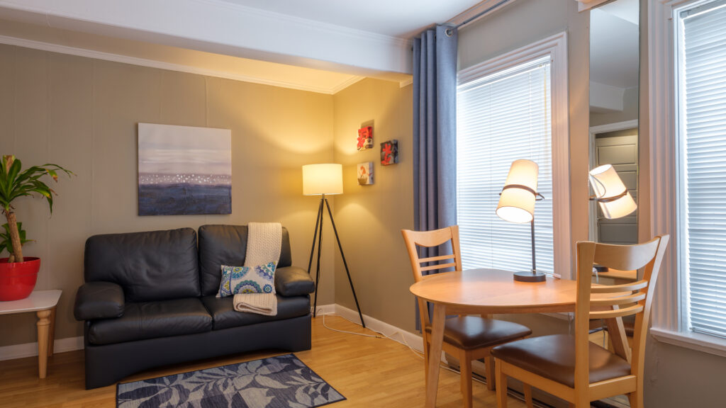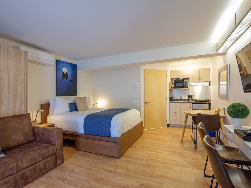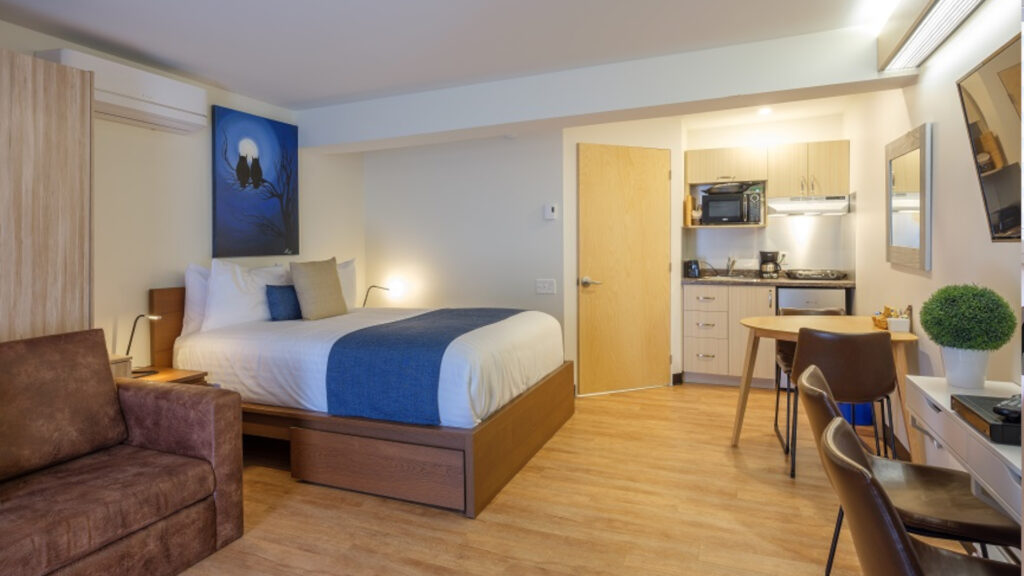 Chacun des studios sont situés directement au centre ville à proximité de plusieurs commerces. Ils possèdent tous une galerie indépendante avec une table bistro. Les studios disposent également d’une cuisinette équipée ainsi qu’une serrure électronique à la porte de l’unité.